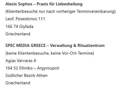 Über Alexis Sophos und SPEC MEDIA GREECE kann für Sie ein einzelnes Medium wie Alexis das Liebesmedium, ein ganzes Team oder sogar Ihr persönliches Wunsch-Medium irgendwo auf der Welt arbeiten – auf Wunsch bleiben Sie dabei vollständig anonym. Wir organisieren und dokumentieren alles transparent. Sie sagen nur, was Ihr Herz will – wir setzen es für Sie um.