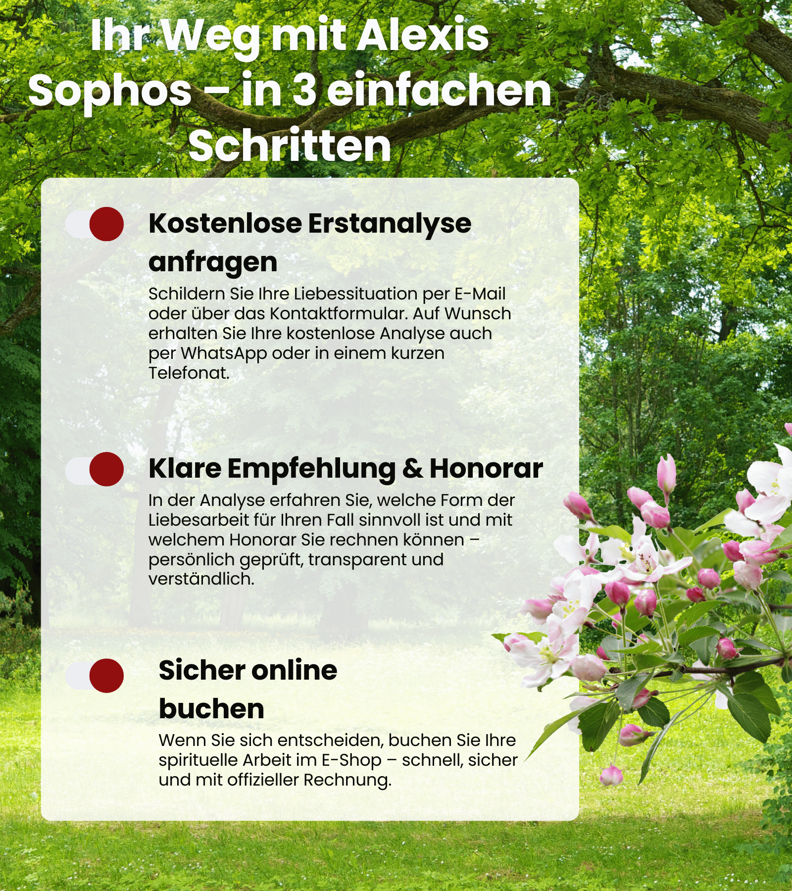 Wer besonders schnell einen Termin möchte, bucht ein 20-minütiges Analyse-Gespräch mit Alexis Sophos für 40 € inklusive 24 % MwSt. In dieser Analyse legen wir fest, welche Form von Partnerrückführung oder Liebesheilung sinnvoll ist und mit welchem Honorar Sie rechnen können.